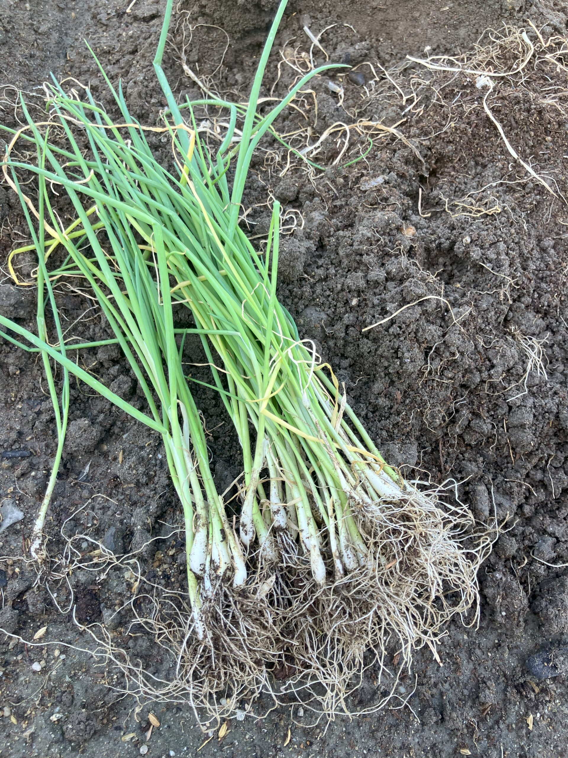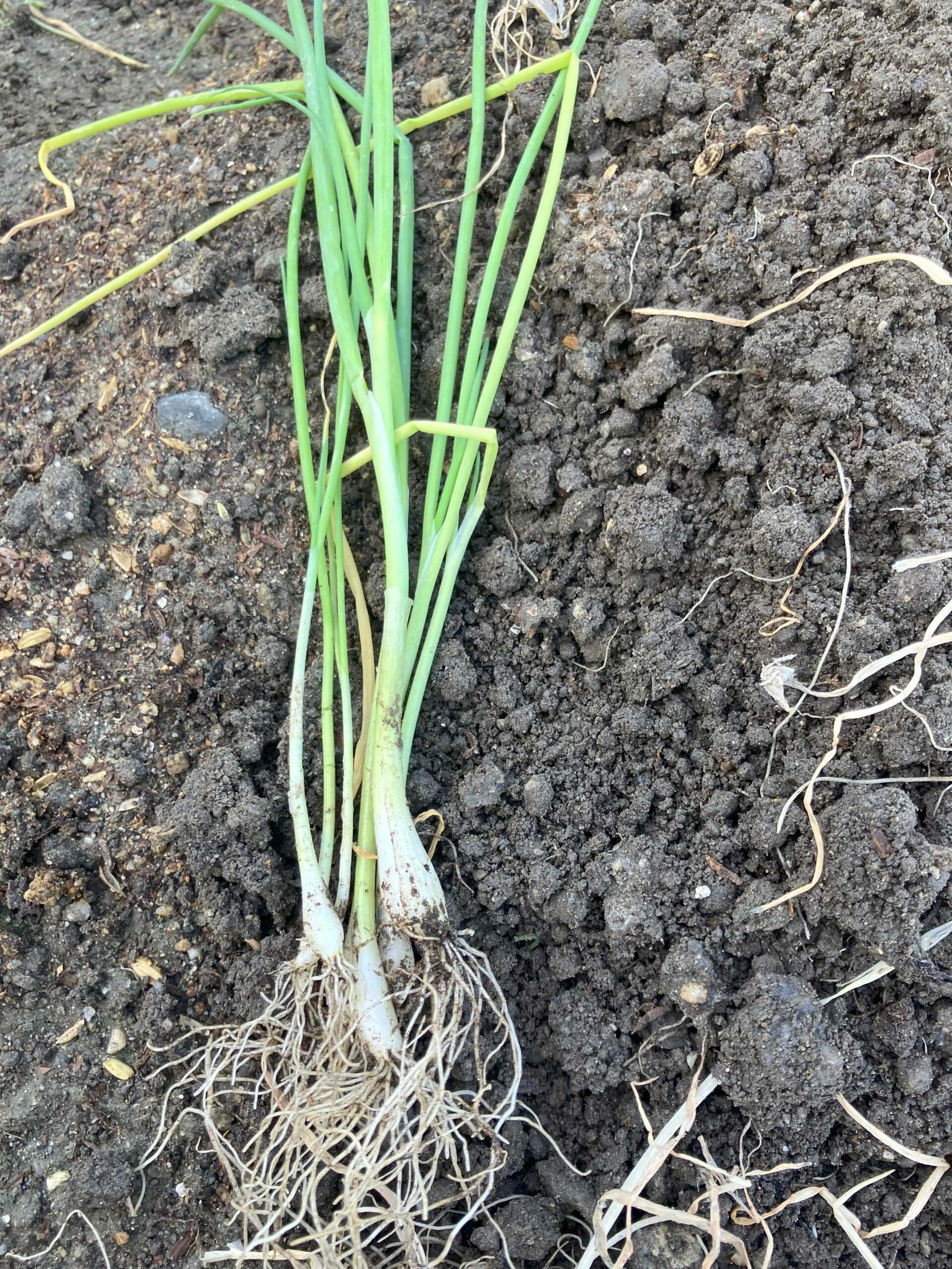 ネギの苗の束を一本ずつほぐし、余分な根を取り除き3~4本ずつ束ねて土で苗を立たせるようにしっかりと植えていく…