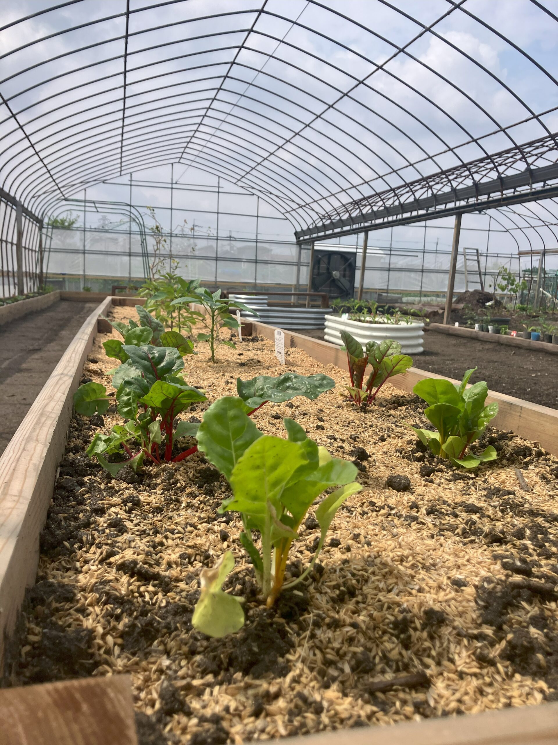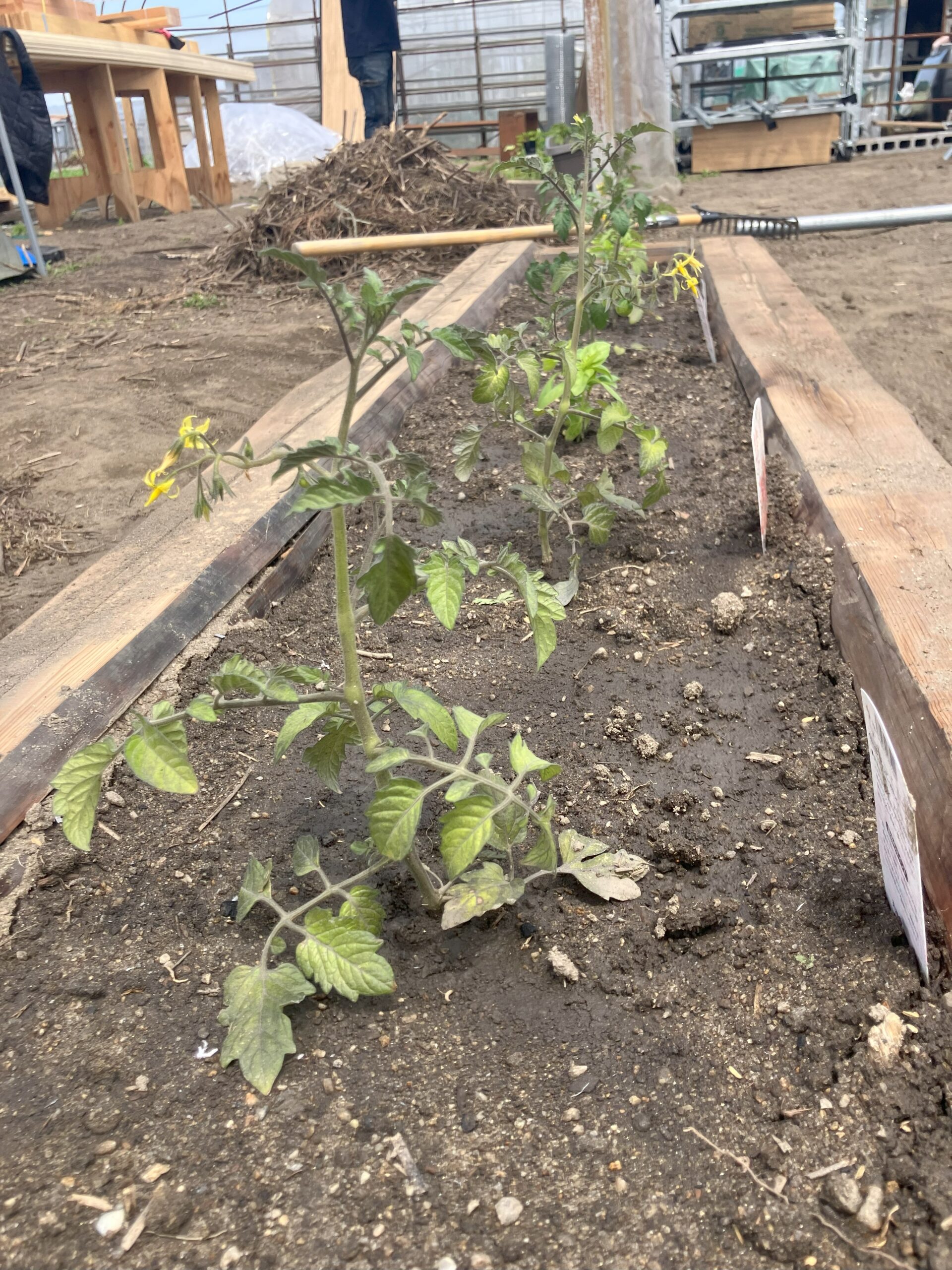 中央のレイズドベッドにはトマトとトマトと相性の良いバジル、ビニールハウスの際にはパールゴーヤを植えました。